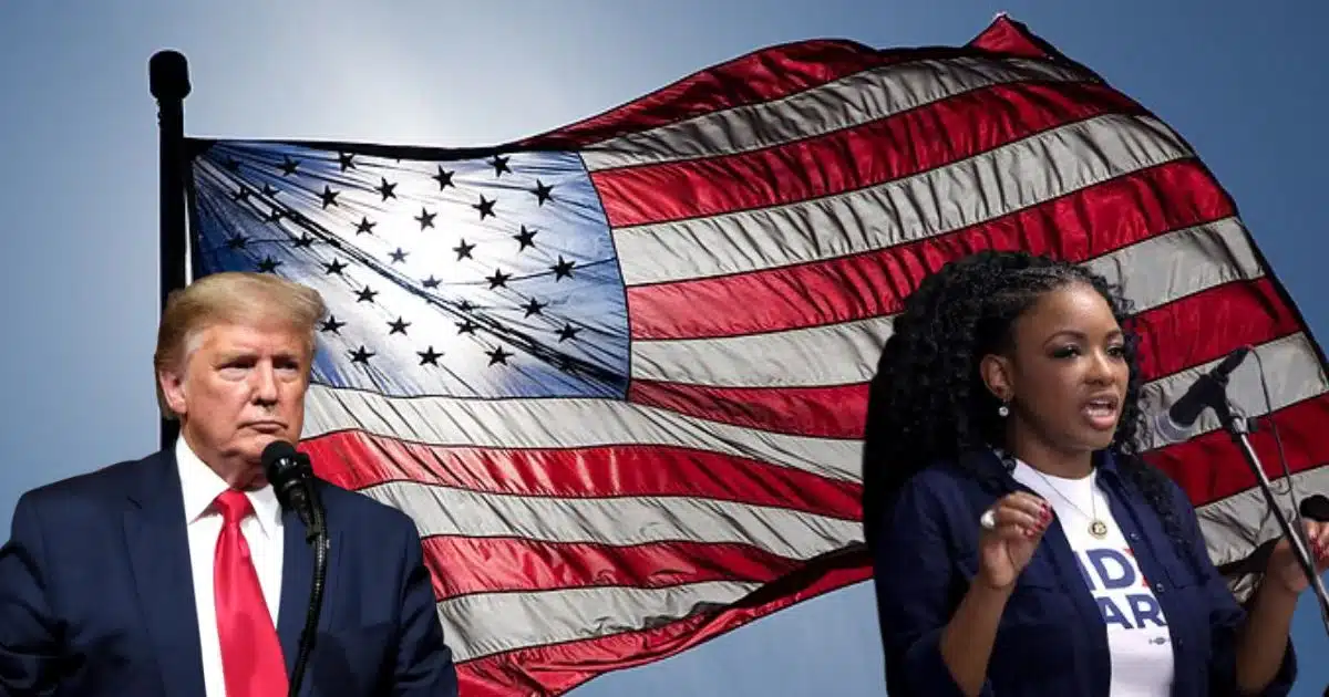 No elections in 2028? People React to Jasmine Crockett’s Unusual Suggestion Flag of United States from ( Author Jnn13 via Wikimedia Commons) Picture of Jasmine Crockett (Photo by Gage Skidmore via Flickr) and Picture of Donald Trump ( via Wikimedia Commons)